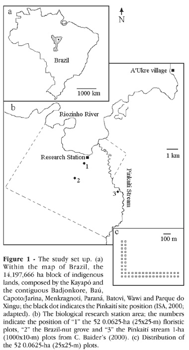 C. Baider (2000) estimated the Pinkaití tree species a-diversity with two 1-ha (10x1000m) quadrats set up in tall open forest type, and found that it is low, if compared to more aseasonal sites elsewhere in the Amazon (Gentry, 1988). One of them was located within a Brazil-nut (Bertholletia excelsa Humb., Bonpl. & Kunth) grove (hereafter, Brazil-nut grove plot), approximately 3 km inland from Riozinho River and had 594 trees of 102 species. The other crossed a forest along a permanent river valley (from now on, Pinkaití Stream plot) and had 540 individuals of 98 species (Fig 1b).