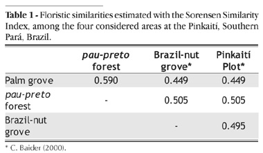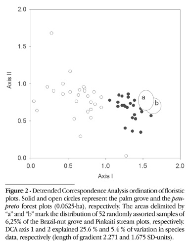For the fitossociological analysis of the Pinkaití site, four different areas were considered: (1) the palm grove, with 24 0.0625-ha plots and (2) the pau-preto forest, with 28 0.0625-ha plots, whose distinction was observed in the field and confirmed by the ordination analysis of tree species abundance and composition (see below), the (3) The Brazil-nut grove and the (4) Pinkaití Stream 1-ha plots, from C. Baider (2000). To describe the structure of the main populations of the four areas, were calculated importance value index (IVI), Shannon diversity and similarity indices (Whittaker, 1972; Pielou, 1975).