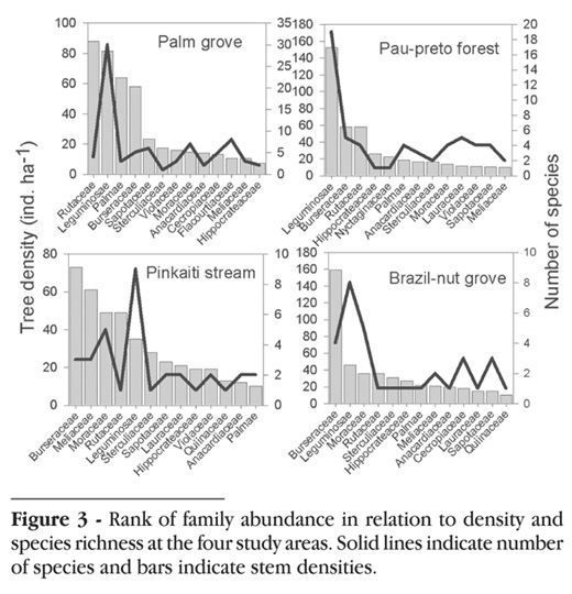 All plots showed that Leguminosae, including the families Fabaceae, Mimosaceae and Cesalpiniaceae, was the most species-rich family. The Rutaceae, mostly represented by the understorey tree M. flavida is almost ubiquitous across all terra firme forest plots. At the palm grove, the Rutaceae was the family with the highest number of stems, followed by the Leguminosae and Palmae. At the pau-preto forest, Leguminosae was the most abundant family, chiefly represented by C. tocantinum. The Burseraceae and Rutaceae were the second-ranking families in number of individuals, mainly represented by T. altissima and M. flavida, respectively. In both the Brazil-nut and Pinkaití Stream plots, the Burseraceae was the most abundant family, chiefly represented by T. altisissima (Fig 2).