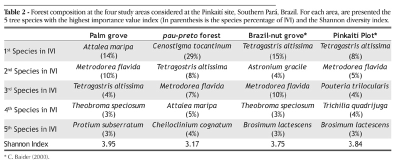 The Shanon Diversity Index indicated that the tree species community of the palm grove is even more diverse than that of the Pinkaití river valley, among the undisturbed sites, the most diverse compared area. The Brazil-nut grove was intermediate in tree species diversity and the lowest values were found in the pau-preto forest.