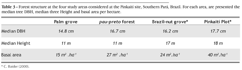 The successional nature of the palm grove is evident on the structure of this forest patch. Its basal area is extremely low (15 m2.ha-1), significantly lower than that of the adjacent pau-preto forest. Such basal area is even lower than the limits (18-24 m2.ha-1) considered for liana forests (Pires & Prance, 1985). The average height of the palm grove forest, on the other side, is not significantly different from the adjacent forest.