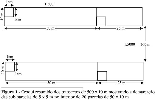 Foram demarcadas 20 sub-parcelas de 25 m2, alocadas cada uma no interior de dois transectos de 5.000 m2, distantes entre si 200 m (Figura 1), a pouco utilizados para estudos florísticos do componente arbóreo (Oliveira et al., dados não publicados). A abordagem dos espécimes arbóreos, arbustivos, herbáceos, palmeiras e lianas seguiu o critério de classificação em categorias de altura (Higuchi, 1985; Lima-Filho, 1995; Lima-Filho et al., 2002), adotando-se as seguintes classes: C1 (altura < 0,5 m), C2 (0,5 < altura < 1,5 m), C3 (1,5 < altura < 3,0 m) e C4 (altura > 3 m e CAP < 0,3 m).
