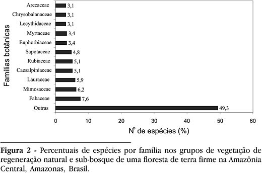 A família Fabaceae apresentou o maior número de espécies (27), seguida por Mimosaceae (22), Lauraceae (21), Caesalpiniaceae e Rubiaceae (18), Sapotaceae (17), Euphorbiaceae e Myrtaceae (12), Arecaceae, Chrysobalanaceae e Lecythidaceae (11) (Figura 2). Conjuntamente, essas onze famílias representam mais de 50% da riqueza local, assemelhando-se aos padrões registrados em outros estudos de regeneração natural na Amazônia Central (Vieira, 1989; Lima Filho, 1995; Lima Filho et al., 2002).