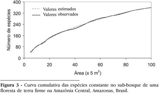 O H' para a área total foi de 5,60 nats/indivíduo (Tabela 3), indicando que esse ambiente florestal apresenta grande diversidade florística, pois suplantou os limites máximos de 4,5 a 5,0 nats/indivíduo para as comunidades naturais (Pielou, 1966; Margalef, 1972). Essa alta diversidade pode ser confirmada ainda a partir da curva espécie-área (Figura 3) .