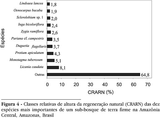 Segundo alguns estudos (Volpato, 1994; Nappo, 1999), a metodologia proposta por Finol (1971) para estimar a regeneração natural induz as espécies que possuem alta densidade em uma determinada classe de altura, a manifestarem os maiores valores para esse parâmetro vertical. Esses estudos podem ser demonstrados por intermédio de Licania caudata Prance e Monotagma tuberosum Hagberg que apresentaram, respectivamente, 145 e 86 indivíduos, todos na classe inferior de altura (Tabela 1), gerando os dois maiores valores relativos de altura da regeneração natural (CRARN) (Figura 4). A partir dessas informações, verificou-se que os maiores índices de CRARN nem sempre significam maiores contribuições na regeneração natural total, uma vez que Duguetia flagellaris Huber, embora tenha o quarto maior CRARN, foi a segunda em participação na regeneração natural das demais espécies (Tabela 3). Diante disso, pode-se inferir que os valores de regeneração natural alto, a partir da CRARN também alto, podem não retratar de forma confiável a real importância ecológica das espécies dentro da comunidade vegetal.