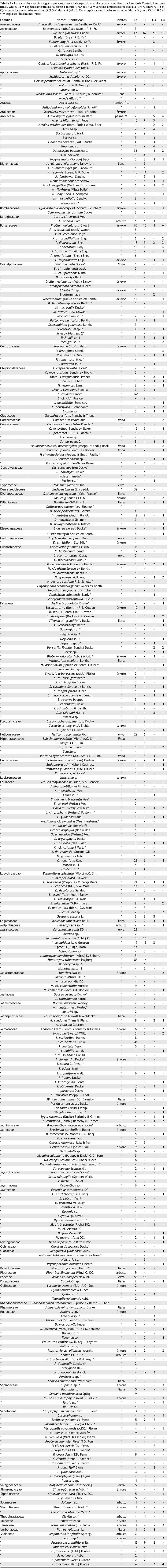 Lima-Filho, D.A; Revilla, J.; Coêlho, L.S.; Ramos, J.F.; Santos, J.L.; Oliveira, J.G. 2002. Regeneração natural de três hectares de floresta ombrófila densa de terra firme na região do rio Urucú, Amazonas, Brasil. Acta Amazonica, 32:555-570.