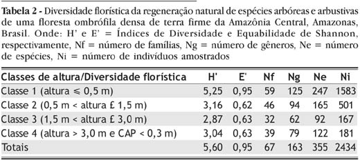 Quando comparada a diversidade obtida nesse estudo às de outras florestas brasileiras (Gisler, 1995; Nappo, 1999), cujos índices variaram de 2,7 a 4,1 para a regeneração natural, pode-se concluir que a área inventariada é uma das mais diversificadas para esses grupos de vegetação.