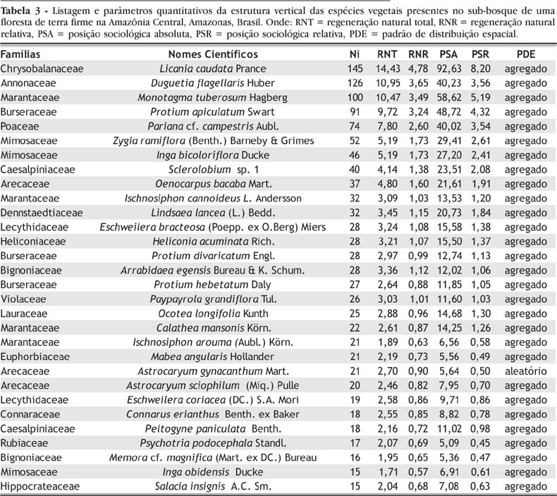 Dentre as 355 espécies identificadas no levantamento, 30 destacaram-se relativamente quanto aos parâmetros regeneração natural e posição sociológica, retratando cerca de 43% de todas as espécies constantes na amostragem (Tabela 3). Notou-se ainda, que, desse percentual, as espécies Licania caudata Prance, Duguetia flagellaris Huber, Monotagma tuberosum Hagberg, Protium apiculatum Swart, e Pariana cf. campestris Aubl., respondem por 18% da regeneração natural. Enquanto isso, 283 espécies obtiveram índices de regeneração inferiores a 1,0, representando em sua totalidade mais de 38% das espécies registradas.