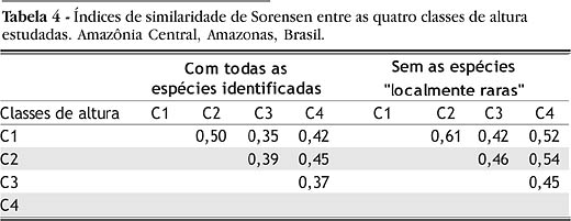 As similaridades entre as classes de altura foram comparadas por intermédio do índice qualitativo de Sorensen (Müeller-Dombois & Ellemberg, 1974).