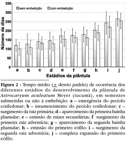 O conhecimento da germinação, envolvendo os aspectos morfológicos, é importante para estudos taxonômicos, ecológicos e agronômicos. No caso do tucumã, entretanto, o processo germinativo não foi completamente descrito, bem como não foram identificas as estruturas das plântulas em formação. Os métodos e as técnicas de produção de mudas são insuficientes e precários, o que provavelmente contribui para desestimular o estabelecimento de plantios da espécie. Diante disso, foi realizado o presente trabalho que teve como objetivo descrever e caracterizar cronologicamente os estádios morfológicos da plântula, durante a germinação de sementes de tucumã submetidas ou não ao pré-tratamento de embebição.