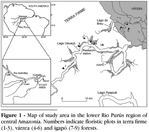 Rio Purús is a white-water tributary joining the Rio Solimões from the south, with its headwaters arising in the pre-Andean slopes of Peru. The Purús catchment covers approximately 375,000 km2, and is the sixth largest tributary drainage area in the Amazon basin (Goulding et al. 2003). Due to its meandering nature, the river is extremely long (approximately 3,200 km) and sustains approximately 40,000 km2 of floodplain forest. This is more than any other tributary of the Amazon River (Goulding et al. 2003). Erosion and sedimentation processes resulting from the kinetic energy of water discharge serve to create numerous channels, lakes and forest levees. The combination of lakes, unflooded and flooded forests and floating-meadows makes this a highly productive and diverse region. For example, the Rio Purús is the most important supplier of fish landings for the Manaus population (Bayley and Petrere, 1989) which is over 1.5 million strong. However, apart from William Chandless' seminal geographical expedition in the 1860s (Chandless, 1866) and Huber's pioneering naturalistic exploration and description of the tree communities in the Purús river region (Huber, 1906) little biological and conservation research has been carried out since (cf. Goulding et al. 2003). The purpose of this paper is to introduce an entirely new study site in the lower Purús region of central Brazilian Amazonia and describe and contrast the forest structure, floristic and soil characteristics of the unflooded and flooded forest landscape which dominates the area.