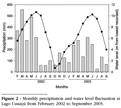 At Lago Uauaçú, the total annual precipitation for February 2002 January 2003 was 2664.8 mm. The monthly rainfall showed a pronounced seasonal variation, with July through October being the driest months, and February through June the wettest (Figure 2). These trends were similar in the following year (Figure 2). The wettest and driest months during the period of climatic measurements (Feb. 2002 Sep. 2003) were March 2002 with 555 mm, and July 2003 with 27 mm respectively (Figure 2).