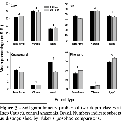 Two-way ANOVAs on soil granulometry and chemical composition showed that there was a significant difference between forest types in all cases except for potassium (K) (F2,29 = 1.3, p = 0.29). Depth was an important factor for coarse and fine sand, Al+H, P, Fe and Zn (Coarse sand, F2,29 = 52.55, p = <0.001; Fine sand, F2,29 = 15.01, p = 0.001; Al+H, F2,29 = 86.04, p = <0.001; P, F2,29 = 84.33, p = <0.001; Fe, F2,29 = 18.18, p = <0.001). Only coarse sand, P and Fe had a significant interaction between forest type and depth (Coarse sand, F2,29 = 29.64, p = <0.001; P, F2,29 = 42.74, p = <0.001; Fe, F2,29 = 9.39, p = 0.001). Tukey's post-hoc tests showed significant differences in soil texture between forest types. However, there was no significant difference in the percentage of silt between terra firme and igapó, whereas there was a significant difference between forest types in all other comparisons (Figure 3). The soils were fairly acidic in all forest types, but less so in várzea (Table 1). Várzea contained the highest concentrations of 7 (Ca, Mg, Al, K, Fe, Zn and Mn) out of 9 elements analysed. Similar levels of Ca, Mg, Al, Zn and Mn were found in terra firme and igapó as shown by Tukey's post-hoc tests (Table 1). The highest phosphorus concentrations were found in igapó forest.