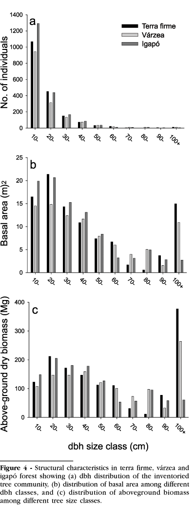 The inverse J-shape curve of the dbh distribution in the three forest types is typical of other Neotropical forest sites (Ayres, 1986; Ferreira and Prance, 1998a; Campbell, 1989; Amaral, 1996; Lima Filho et al. 2001). Similarly, the high proportion of trees <30 cm dbh is similar to observations made from elsewhere in the Amazon (Boom, 1986; Milliken 1998). The mean basal area of terra firme forest (32.6 m2) is almost identical to samples from elsewhere in central Amazonia (Peres, 1991; Milliken, 1998), and identical to one hectare of várzea forest sampled on the lower Japurá river (Ayres, 1986). The mean várzea forest basal area observed in this study was therefore also comparable to that of Ayres (1986) for the Mamirauá Reserve. Likewise, basal area estimates obtained in igapó forest at Lago Uauaçú were comparable to other floristic inventories in black-water floodplains in the Rio Negro basin (Jaú National Park: Ferreira, 1997).