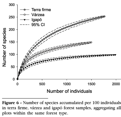 three hectares (Figure 6). These curves also clearly indicate that terra firme forest was the most diverse, whereas várzea forest