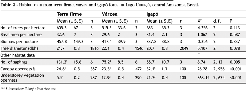 A total of 959 spherical densitometer readings were recorded in the three forest types. Tukey's post-hoc tests showed that there was no significant difference in canopy openness between terra firme and várzea forest, whereas the igapó forest canopy was significantly more open (Table 2).