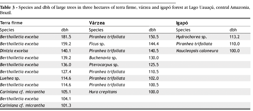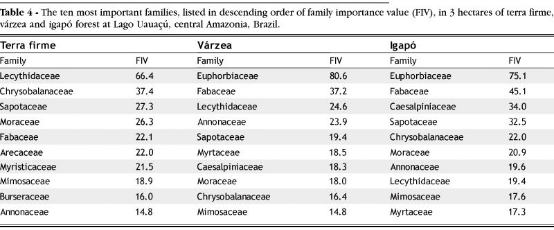 In terms of the family importance value (FIV), the Lecythidaceae was the most dominant tree family in terra firme forest, whereas the Euphorbiaceae was the most important family in várzea and igapó forests (Table 4). The dominance of Lecythidaceae in terra firme is a reflection of the large sizes attained by some species in this family, such as Bertholletia excelsa and Cariniana cf. micrantha (Table 3). Although size is also important in várzea, the dominance of Euphorbiaceae in várzea and igapó forest primarily reflects the large number of individuals and species belonging to this family.