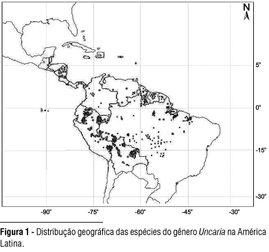 O gênero Uncaria é representado por cerca de 60 espécies de lianas distribuídas principalmente na África e Ásia (Obregón, 1995; Steyermark, 1974) sendo que, Uncaria guianensis e U. tomentosa (Ridsdale, 1978; Zavala & Zevallos, 1996), ocorrem em amplas áreas da Amazônia brasileira e demais países da América Central (Guatemala, Belize, Honduras, El Salvador, Nicarágua, Costa Rica, Panamá) e do Sul (Colômbia, Venezuela, Guiana, Equador, Peru e Bolívia), indicadas como seu centro de origem (Villachica et al., 1998; Zevallos et al., 2000) (Fig. 1). As plantas de Uncaria são, em geral, lianas, arbustos- trepadeiras ou rasteiras ascendentes, com um par de espinhos, originados de pedúnculos abortivos, utilizados para galgar a copa das árvores (Ridsdale, 1978; Reinhard, 1999; Zevallos et al., 2000), denominadas de "unha de gato" por Steyermark (1974). Possuem folhas simples e opostas, lâmina ovada, elíptica, consistência cartácea ou papirácea e um par de estípulas interpeciolares, livres na base, deltóide, obovada, com tomentos na superfície da folha em Uncaria tomentosa e grabra em U. guianensis (Zavala & Zevallos, 1996). A casca, lenho e folhas dessas plantas têm sido usadas pelos povos amazônicos (ex.: os Ashaninkas do Peru) para o tratamento de inúmeras enfermidades (gastrite, úlcera, diarréia, artrite, câncer, etc.) e como abortivo (Zevallos et al., 2000), corroborando os resultados das pesquisas realizadas pela indústria farmacêutica (Keplinger et al., 1999). Dentre os usos medicinais atuais das plantas de Uncaria mencionam-se suas propriedades como estimulantes do sistema imunológico e contra o câncer, além da aplicação contra a AIDS (Lock de Ugaz, 1994; Urrunaga, 1994; Keplinger et al., 1999) e ação anticonceptiva (TCA, 1995) e afrodisíaca (IPSS, 1997). A seiva da unha de gato, pelas suas propriedades energéticas e nutritivas, é utilizada pelos povos das florestas (Cabieses, 1997). A indústria de medicamentos naturais fabrica remédios para doenças cardiovasculares (Wang, 1989; Huang, 1999) renais, ginecológicas, gastrointestinais, hepáticas, reumatológicas e reprodutivas (Keplinger, 1999), imune estimulante, antimicrobianos e antivirais (Aquino et al., 1989) além de aumentar a resistência dos tecidos (Desmarchelier et al., 1997). Apesar da extensa bibliografia médica, as informações sobre a anatomia das duas espécies de Uncaria concentram-se na sua casca (Silva et al., 1998; Lindorf, 2001). Em relação a madeira existem apenas descrições gerais do lenho na Amazônia peruana (Chavesta & Gonzáles, 1996; Zevallos et al., 2002).