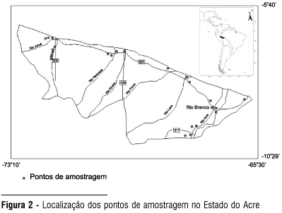 Localização das coletas: o material botânico de Uncaria guianensis (Aubl.) J.F. Gmel e U. tomentosa (Willd. Ex Roem. & Schult.) DC. foi coletado nos trabalhos de campo realizados em 18 municípios do Estado do Acre, a saber: Acrelândia, Assis Brasil, Brasiléia, Bujari, Capixaba, Cruzeiro do Sul, Epitaceolândia, Feijó, Mâncio Lima, Manoel Urbano, Plácido de Castro, Porto Walter, Rio Branco, Rodrigues Alves, Senador Guiomard, Sena Madureira, Tarauacá e Xapuri (Fig. 2).