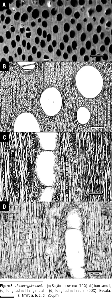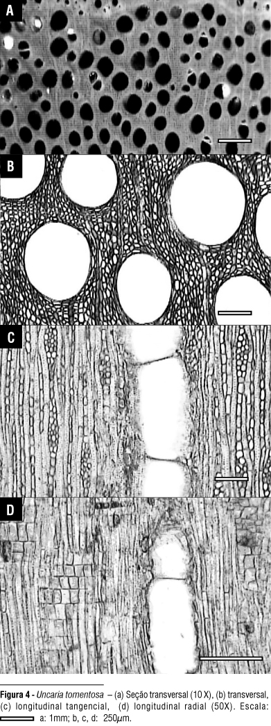 Análise da estrutura macroscópica do lenho: para a observação da superfície do lenho, os corpos de prova foram inicialmente cortados com navalha em micrótomo de deslize e, em seguida, polidos pela abrasão em pedra de afiação de granulação fina umedecida em água e em tecido macio para propiciar o contraste dos elementos anatômicos. A densidade básica foi obtida pela massa seca do lenho (em estufa) pelo volume verde (saturado em água até peso constante). A estrutura anatômica macroscópica do lenho das duas espécies de Uncaria, observada sob microscópio estereoscópico, foi descrita atendendo as normas da COPANT (1974) e Coradin & Muniz (1992).