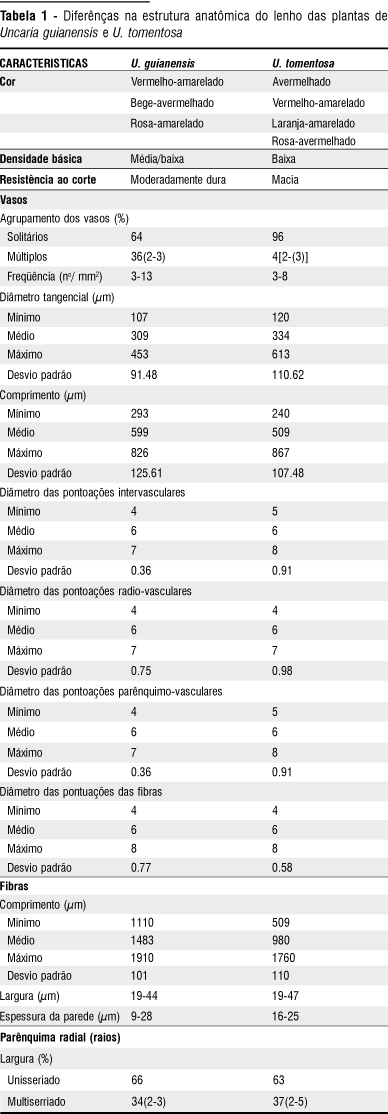 As duas espécies de Uncaria apresentaram lenho avermelhado, com variações do amarelado ao rosado ou bege ao alaranjado, característica da família Rubiaceae (Détienne & Jacquet, 1983) e distintas das de Pentagonia e Chomelia, de cor clara, do branco ao bege claro (Freitas et al., 1992). O odor indistinto, grã direita, textura médio-grossa, brilho moderado e densidade básica baixa a média, resistência ao corte de mole a moderadamente dura (U. guianensis) corroboram a descrição apresentada por Zevallos et al. (2002) e Chavesta & Gonzáles (1996). As características anatômicas do lenho das duas espécies de Uncaria são coincidentes com as descritas para outras espécies da família (Jansen et al., 2002; Record & Hess, 1949; Freitas et al., 1992; Detienne & Jacquet, 1983; Metcalf & Chalk, 1972; Mainieri & Chimelo, 1989), exceto para os vasos de maior diâmetro, o parênquima axial difuso e os raios largos e altos, próprios das lianas (Carlquist , 1991). Pontoações intervasculares guarnecidas e fibras septadas, comuns na família não foram observadas. A semelhança do lenho das duas espécies é perceptível, sendo os vasos difusos, com diâmetro uniforme e largos (>309 µm), arredondados, predominância de solitários, pouco numerosos (6-10/mm²), curtos a muito longos (301-1000 µm) e com pontoações arredondadas. O parênquima axial é apotraqueal difuso em agregados, unilateral distinto ou quase distinto sob lente e o radial unisseriado, coincidente com Silva et al., (1998), e com Zevallos et al., (2002) somente em U. guianensis (indicou multisseriados para U. tomentosa), heterocelulares, número de células (7-42), largos (101-200 µm), medianos a moderadamente altos (2-20 mm), poucos a muito numerosos (3 a >29/mm). As fibras mostram pontoações areoladas, maiores de 3 µm, médias a medianamente longas (0,9-2,2/mm), estreitas a largas (<24 a > 40 µm) e com paredes muito delgada a espessa. As diferenças das espécies, encontram-se na largura dos raios, na proporção de vasos solitários e na freqüência dos mesmos; podendo ser resultado do hábito de crescimento e habitat das plantas: U. guianensis, de hábito lianescente com tendência a arbustiva, em florestas secundárias e U. tomentosa, de hábito lianescente, em florestas primárias (Zevallos et al. 2000), relação que destaca nas lianas (Carlquist, 1985).