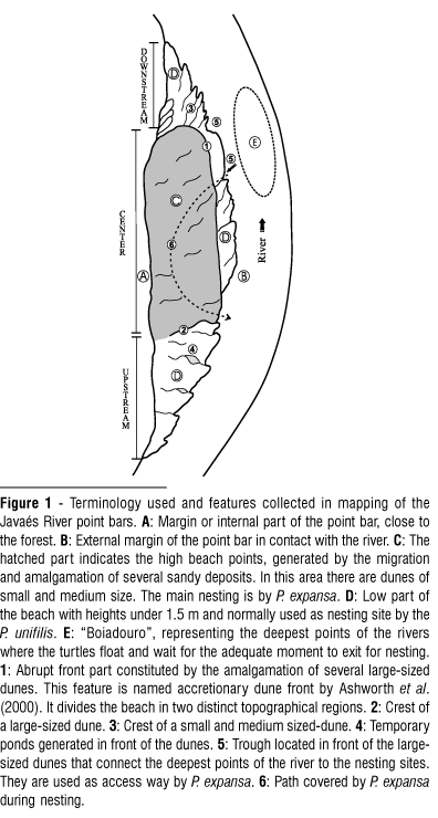 In the area of the Crixas-Açu River monitored by Ibama, five beaches with a high nesting concentration were studied, where about 1700 P. expansa nested in 2000. The morphological characteristics of the nesting beaches are similar, allowing for a diagnostic of geomorphologic and sedimentological patterns of the sites chosen by the turtles for nesting. As a general characteristic, all the sites with high concentration nests can be classified as point bars and the geological complexity of these bars will depend mainly on their dimensions. Smaller bars present a simpler arrangement but usually without the platform originated by the dunes migration and superposition. The point bars with smaller dimensions, such as Assombrado Beach, present a ramp surface without significant unevenness. The scarce dunes found upstream or downstream are usually lower than 50 cm in high.