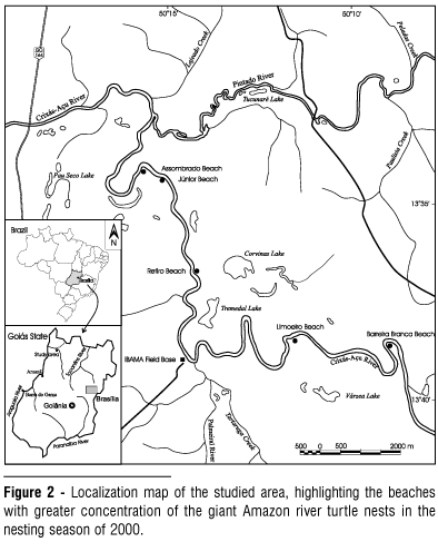 In order to establish patterns of geological influence on the choice of nesting places by this turtle, several studies have been carried out in the Middle Araguaia and Crixás-Açu rivers (Ferreira Júnior, 2003, Ferreira Júnior & Castro, 2003, 2005). The geological aspects such as geomorphology and sedimentological characteristics of these beaches have been studied. This paper analyzes the giant Amazon river turtle nesting areas in the Crixás-Açu River in the state of Goiás (Brazil) during the nesting season of 2000.