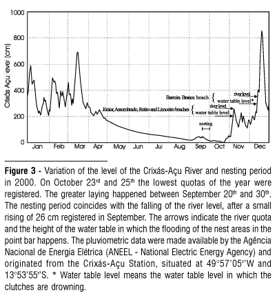 The Crixás-Açu River level varied 857 cm in 2000, with the highest level registered on 20 December, and the lowest on 25 October (Fig. 3). In 2000, during the months of June to October, the Crixás-Açu River reached its lowest level, exposing point bars (hereafter denominated beaches) that were used by the turtles as nest sites. The river level decrease is slow and gradual, but its rise is rapid and irregular.