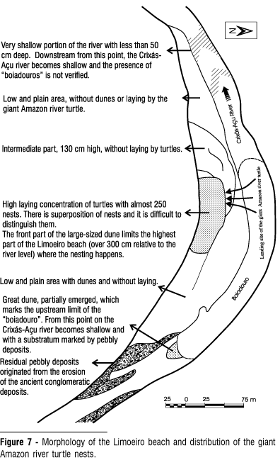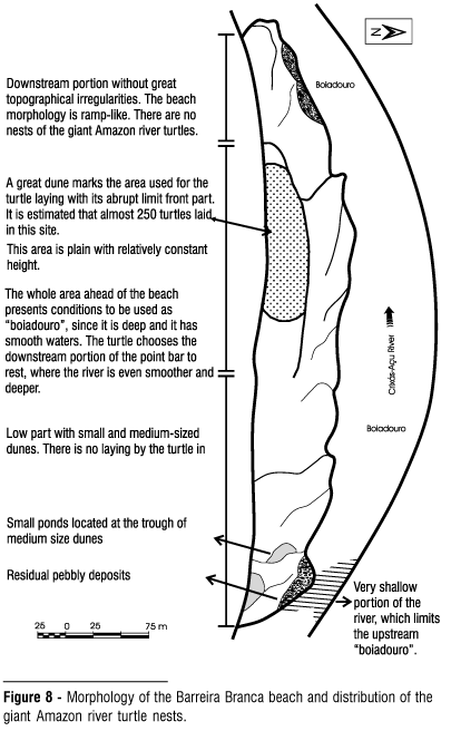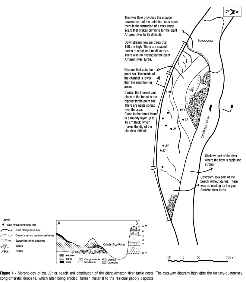 The larger point bars, such as the Limoeiro and Retiro beaches, show a more complex arrangement, where one can verify the amalgamation of several dunes more than 100 cm high, causing different morphological levels. The boundaries of the dunes mark the morphological differences of the sites chosen by the giant Amazon river turtles for nesting. The absence of vegetational cover and the presence small dunes, and their loosely packed sediments suggest that the higher point bars' deposits are reworked by annual floods.