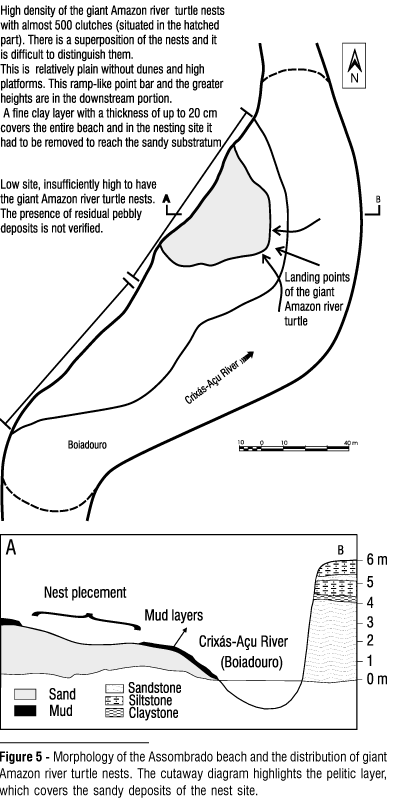 Several different forms and different grain size sediments constitute the beaches nesting for nesting. The maximum height of the beaches is decisive in hatchling success for two reasons. First, the river levels change rapidly in the central and northern regions of Brazil. So, if nests are located in a low topographic position on the beaches hatchlings may drown before they emerge. Second, humidity originating from the underground water table can reduce the nest temperature or drown the embryos.