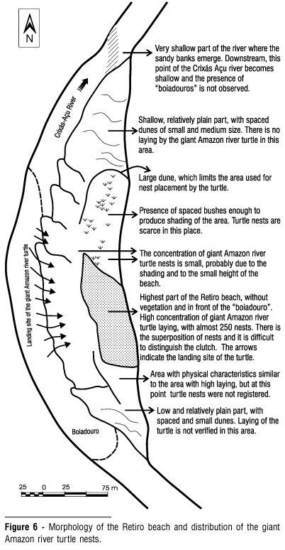 Two platforms characterize the Retiro Beach. The highest platform, between 236 and 260 cm in height, where the turtle nests, can be subdivided in two portions: one upstream that concentrates the nests, without vegetation and close to the "boiadouro"; the other downstream, which in spite of being high with a sandy substrate does not have nests, since it is covered by bushes and the "boiadouro" is not directly connected to the beach. At this last portion, a very abrupt dune blocks the high part of the beach, making the access for the giant turtle difficult. The area used for nesting by the turtle was flooded on 8 November.