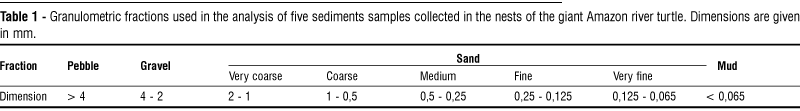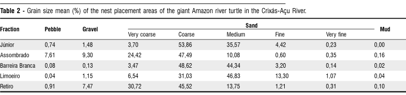 The substratum of the turtle nests is characterized by poorly selected sediments concentrated in the sandy fraction (Table 2). The grain size of the sediments could be one of the criteria for the turtle selecting nesting areas in the Crixás-Açu River. The turtles always nested in the high beach areas, as long as the sediments are formed by sand. In the Júnior Beach (Fig. 3), the high places covered by pebbles did not allow the digging of nests, and the turtles laid in the sandy sites, which were lower. In the Assombrado Beach, the 20 cm mud layer had to be removed in order to dig the nests. This fact, combined with the high number of nests, increased nest overlap, since nest digging became easier in the sites where the mud layer had already been removed by giant Amazon river turtles nesting previously.