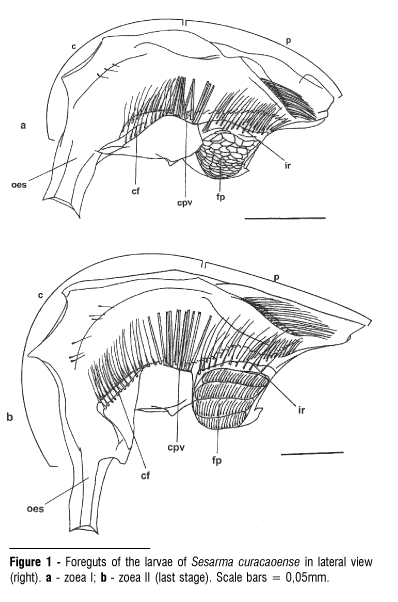 On the other hand, an important investigation on the starvation resistance of larvae of S. curacaoense has revealed that their larvae possess high endotrophic potential (Anger, 1995), and that they are able to develop from embryo to the megalopa in complete absence of food. However, the feeding behavior for these larvae is facultative, once the zoea II of S. curacaoense have shown a delayed development under continued starvation periods. Further, the megalopa reach the juvenile stage without food only if the preceding zoeal stages had been fed continuously. Thus, S. curacaoense has facultative lecithotrophic zoeae and feeding megalopa. These facts suggest a more detailed study of the digestive system of the larvae from this species is needed, in order to understand their feeding biology.