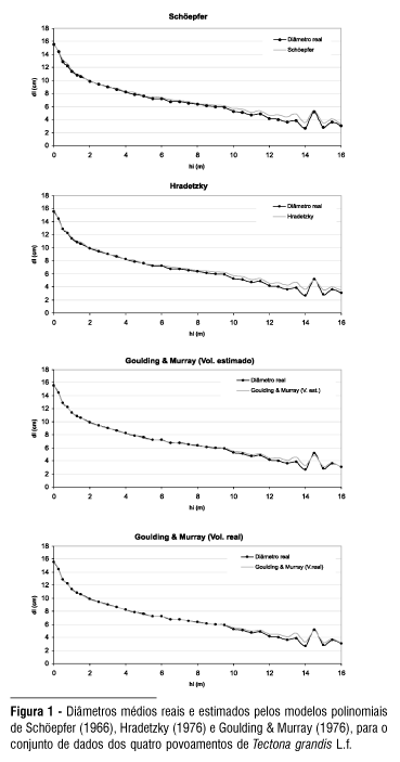 O polinômio de potências inteiras e fracionárias (Hradetzky, 1976) apresentou bons para retratar as extremidades inferiores e superiores das árvores e resultados regulares para a porção intermediária;