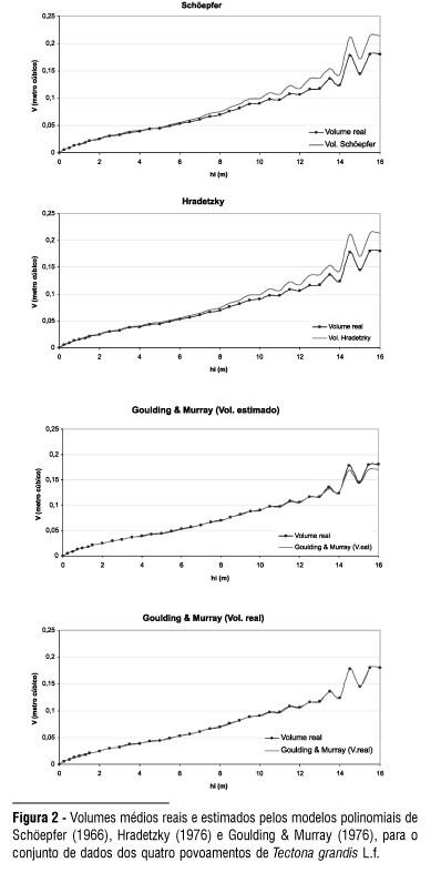Os modelos Schöepfer (1976) e Hradetzky (1976) apresentaram menor aderência com as estimativas do volume real, sendo que, a partir da altura absoluta de cinco metros, as estimativas sempre foram superestimadas e, nas alturas inferiores a cinco metros, ora os valores foram subestimados, ora superestimados.