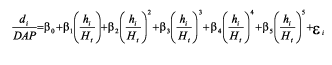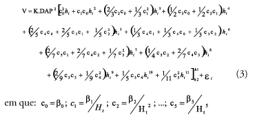 em que: bis = parâmetros a serem estimados; di = diâmetro comercial (cm) ou diâmetro correspondente a qualquer altura hi, especificada ou comercial; DAP = diâmetro a 1,3 m de altura (cm); Ht = altura total (m); hi = altura comercial (m); e, ei = erro de estimativa.