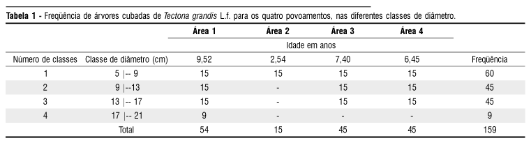A amostra das árvores cubadas rigorosamente foi baseada na distribuição diamétrica dos povoamentos, cujas classes de diâmetro foram construídas com um diâmetro à altura do peito (DAP1,30m) mínimo de 5 cm e as amplitudes de classes delimitadas a cada 4 centímetros (Tabela 1).