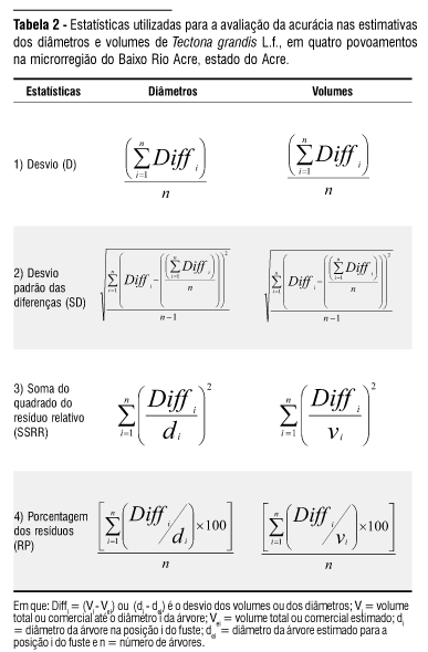 Também foi avaliada a acurácia, ou seja, a diferença entre o valor estimado (diâmetro ou volume) e o valor real. Para isto, foram adotadas as mesmas estatísticas já utilizadas por Parresol et al. (1987), Figueiredo Filho et al. (1996), Fischer (1997), Scolforo et al. (1998), Assis et al. (2001) e Ferreira (2004). Estas estatísticas possibilitam realizar uma análise mais particularizada do desempenho das estimativas ao longo de todo o fuste, uma vez que podem ser calculadas para cada altura, em que foram tomados os diâmetros por ocasião da cubagem rigorosa.