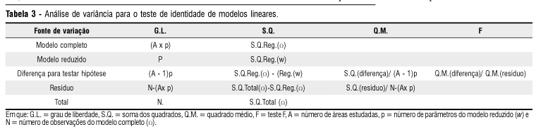 Para modelos lineares, o teste de identidade permite observar estatisticamente, por meio do teste F, a significância da diferença entre o total das somas dos quadrados das regressões ajustadas para cada área de estudo isoladamente (modelo completo - H) e a soma do quadrado da regressão ajustada para o conjunto das quatro áreas estudadas (modelo reduzido - w).