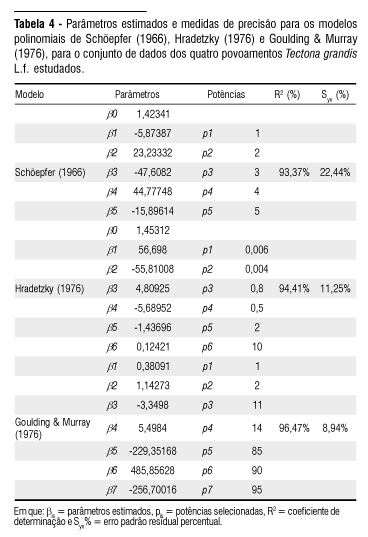 Os parâmetros e potências de todos os modelos polinomiais testados e as respectivas estatísticas de precisão encontram-se na Tabela 4. Para os modelos de afilamento Hradetzky (1976) e Goulding & Murray (1976) foi empregado o procedimento Stepwise para a seleção das variáveis e suas respectivas potências.