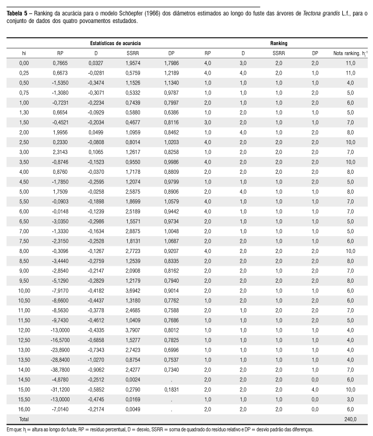 Para a base de dados avaliada, o modelo Schöepfer (1966) apresentou estatísticas que sempre apontaram uma capacidade inferior do modelo de predizer os valores do diâmetro ao longo do fuste. Considerando-se as quatro estatísticas e as 36 posições no fuste, os modelos tiveram 144 oportunidades para pontuar e formar a nota final do ranking. No entanto, o modelo Schöepfer (1966) obteve os piores resultados estatísticos entre os modelos testados, em 66 ocasiões.