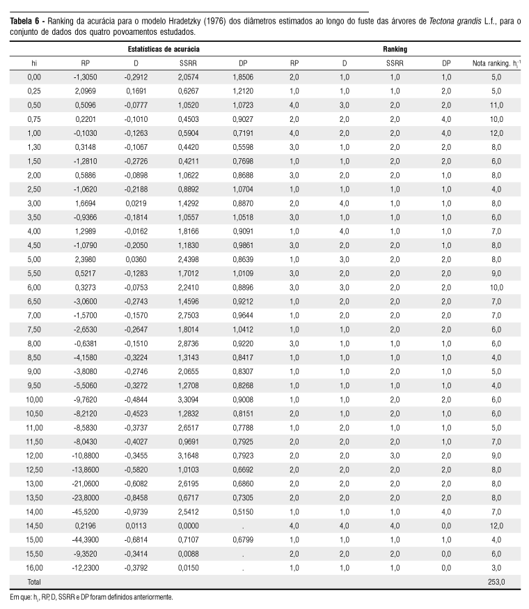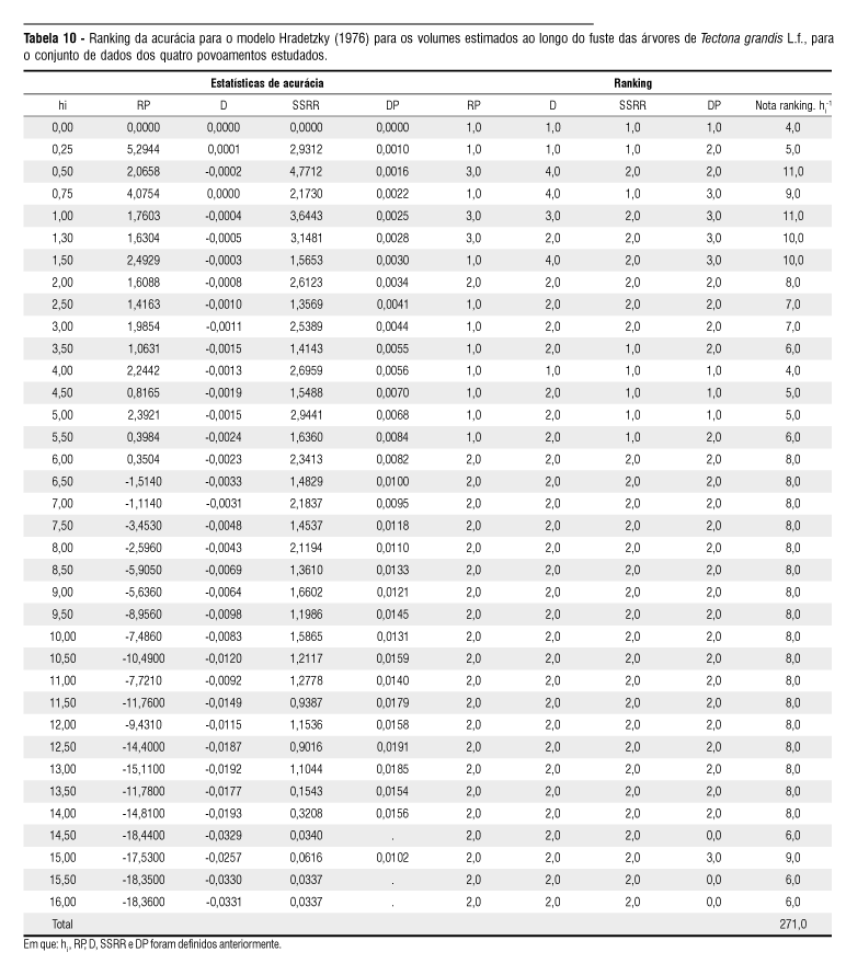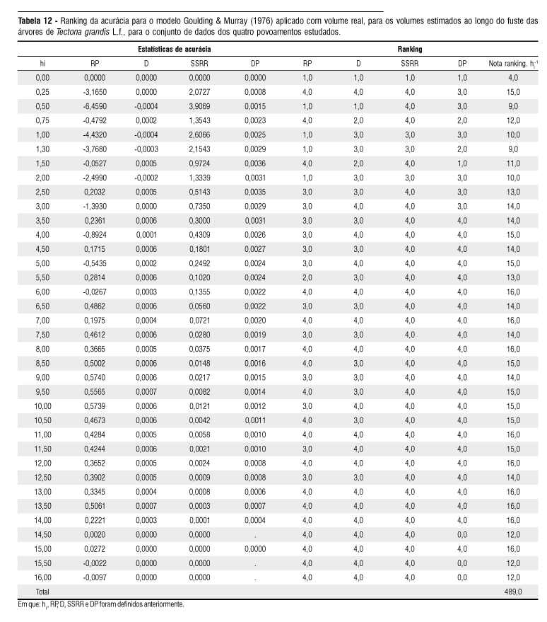 O ranking demonstra que o modelo Hradetzky (1976) obteve melhores estatísticas em duas posições na árvore, na posição de altura absoluta de 6 e 14,5 metros, a primeira posição na porção mediana do fuste e a outra na porção superior no fuste. Nas demais posições do fuste (34 posições), o modelo Goulding & Murray (1976), com emprego do volume estimado, obteve sempre as melhores notas de ranking.