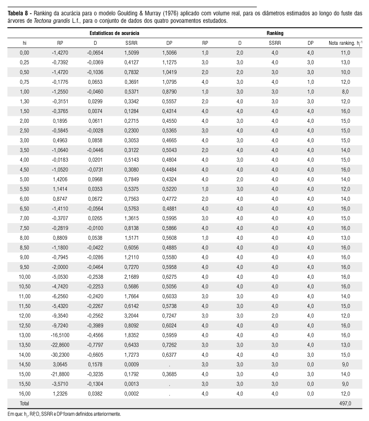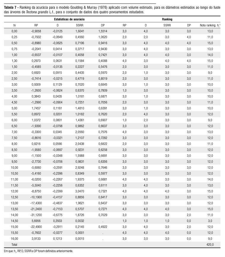 No caso do modelo Goulding & Murray (1976) com volume real (considerado apenas como referência no ranking), destacam-se os resultados de desvio (D), cujos valores, para todos os diâmetros ao longo do fuste, foram muito próximos de zero, mostrando que, ao estabelecer uma compatibilidade com o volume real (dados de cubagem), cria-se uma situação fictícia de falsa acurácia, visto que esta situação em condições de trabalho de campo é tecnicamente inviável, ou seja, realizar a cubagem rigorosa de todas as árvores amostradas.
