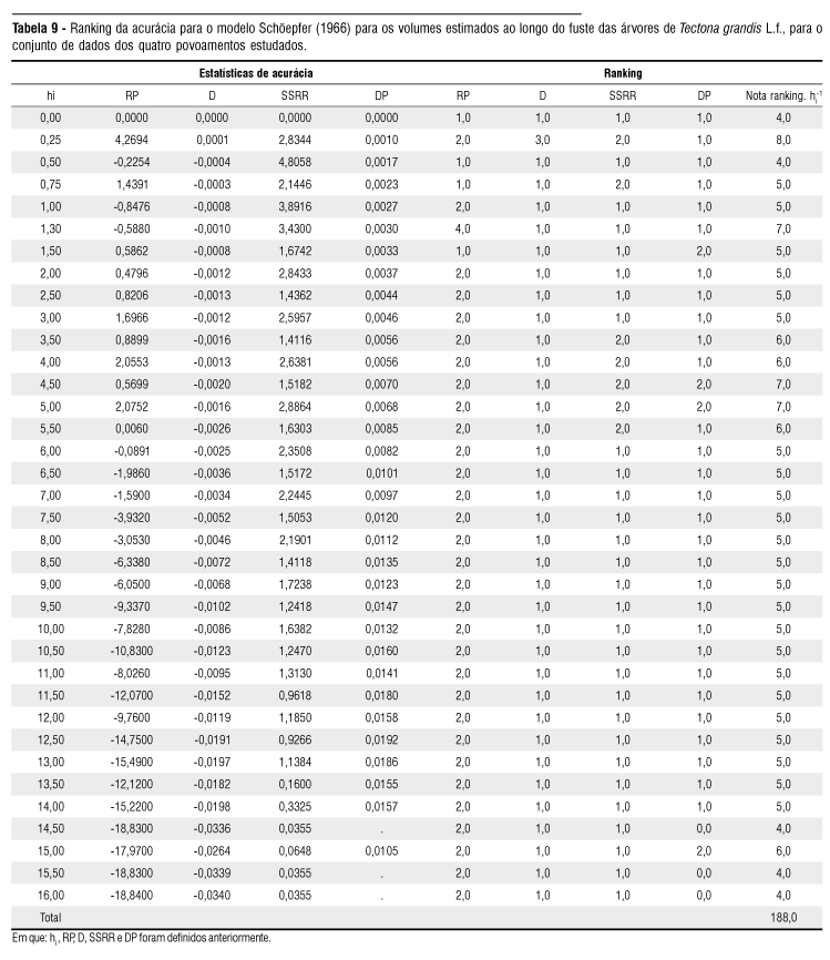 As Tabelas 9, 10, 11 e 12 apresentam os resultados das estatísticas de acurácia para os modelos testados e as notas atribuídas para cada estatística no ranking. Os mesmos critérios estabelecidos para as estimativas dos diâmetros foram mantidos para avaliar as estimativas de volume ao longo das diversas posições no fuste. Nos resultados das estatísticas de acurácia para volume de todos os modelos testados na altura 0,00 foi atribuído o valor 0,0 (zero) e a nota de ranking 1,0, pois não existe volume de fuste na altura 0,00 metro.