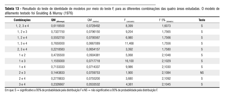 Em todas as combinações testadas, somente a combinação das áreas 2 e 3 foi possível de agrupar. Percebe-se que as combinações que envolvem as áreas {1 e 3} geraram altos valores para o Fcalculado, demonstrando que existe uma forte diferença entre estas duas áreas no que se refere ao afilamento das árvores como retratados pelo modelo de Goulding & Murray (1976).