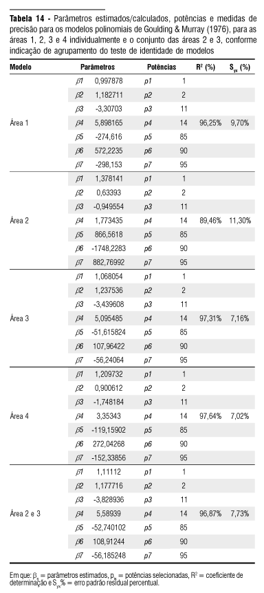 O procedimento de ajuste foi realizado considerando-se os DAP de 1,3 m do solo com casca, para a base de dados das quatro áreas de estudo em conjunto. Posteriormente, as equações ajustadas foram avaliadas pelo teste de identidade de modelos.