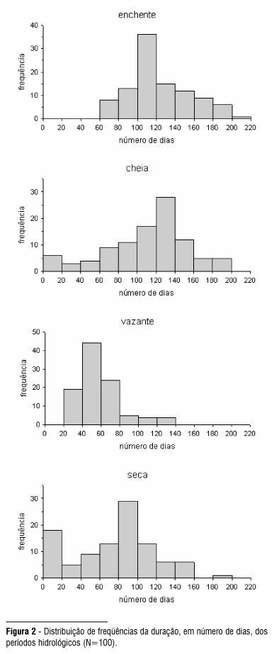Para descrever a variação na duração dos períodos hidrológicos, foi obtida uma distribuição de freqüência do número de dias, agrupados em classes de vinte dias, e calculada a média e o desvio padrão para cada período, após verificada a normalidade dessa distribuição (Figura 2). Com essas informações, definimos a duração típica para cada um dos períodos; como os dados de vazante não apresentaram distribuição normal, a definição de duração padrão foi baseada no histograma de frequência deste período.