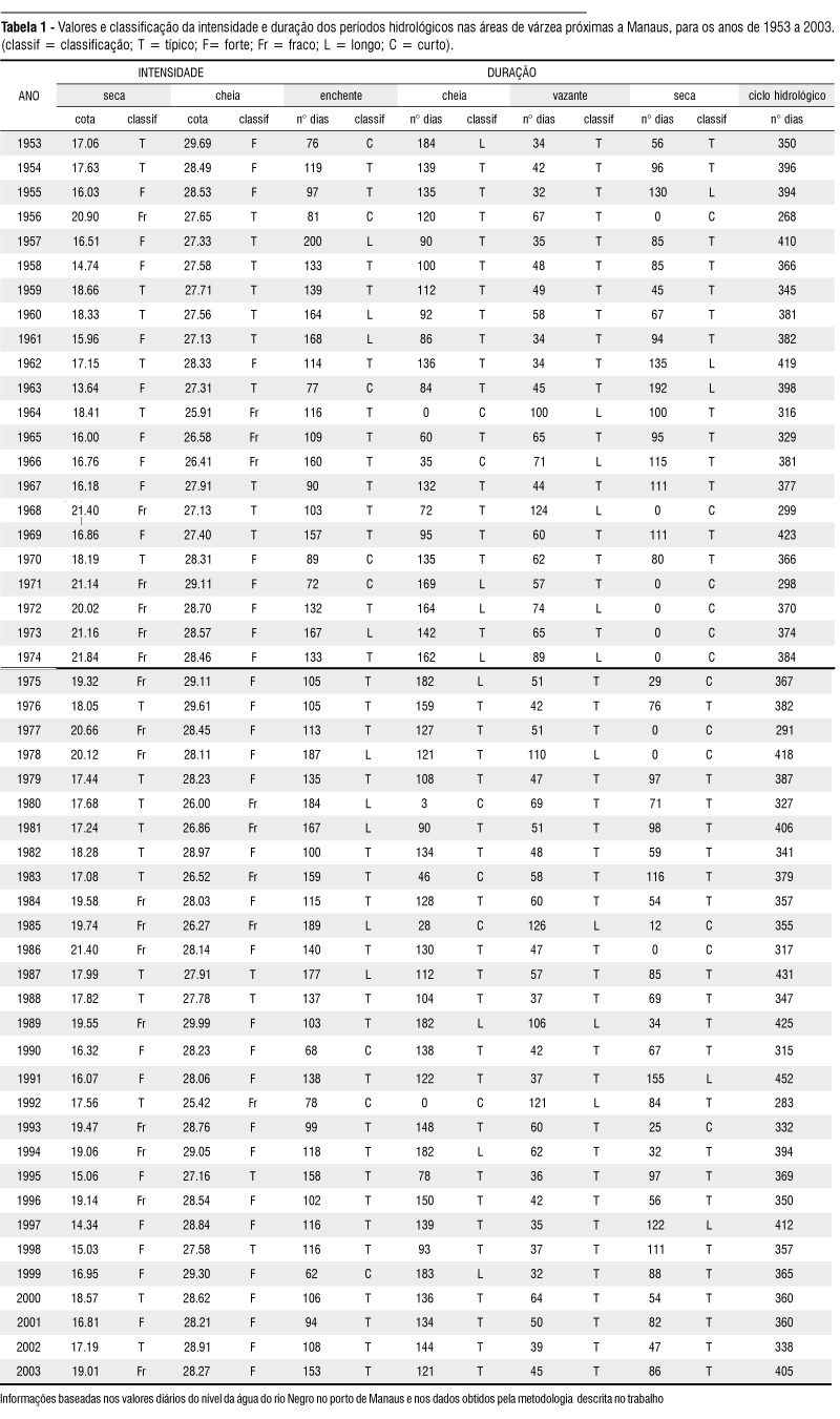 Tendo como base os dados diários do nível da água do porto de Manaus, disponibilizados pelo Serviço de Engenharia da Sociedade de Navegação, Porto e Hidrovias do Amazonas, e a metodologia acima descrita, apresentamos, na Tabela 1, a classificação da duração e intensidade dos períodos hidrológicos dos anos de 1953 a 2003.