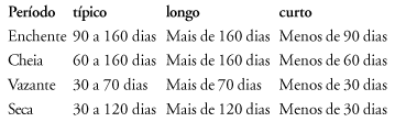 Um ciclo hidrológico completo, em geral, é subdividido em quatro períodos, definidos segundo critérios hidrológicos: seca, enchente, cheia, e vazante. Mas, como determinar quando termina a seca e começa a enchente, por exemplo, quando a duração e intensidade do ciclo e de cada período hidrológico variam de ano para ano? Como classificar e padronizar os períodos quando informações de mais de um local e ano são comparadas?