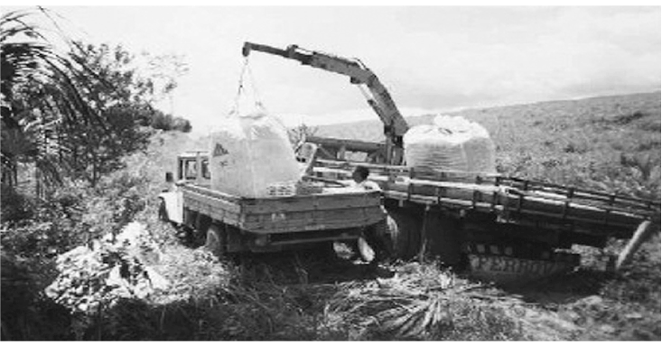 Em relação ao sistema de colheita Frazão (2001) sugeriu um sistema de coleta onde os cocos sejam coletados e transportados até a unidade de beneficiamento em volumes consideráveis. Para facilitar a coleta e transporte dos cocos, foram introduzidos animais de cargas que atrelados com cangalha e jacá fazem o transporte até a uma carroça as quais transportam o equivalente a 1,00 m3 de coco até a unidade de processamento. O tipo de animal a ser usado deve ser respeitar as tradições locais, entretanto em áreas onde existem caminhos em boas condições e a topografia seja favorável, recomenda-se o uso de jumentos, pois são animais dóceis e de fácil lida pelas mulheres. Segundo May (1999) citado por Teixeira (2002), um sistema de coleta dos frutos do babaçu mais eficiente consiste no recolhimento dos frutos em jacás que são transportados por mulas até a margem da estrada mais próxima, onde são transladados para “Big Bags” de 750 kg cada, com o uso de um caminhão com braço hidráulico articulado, estes são recolhidos e encaminhados para o uso final, Figura 1.